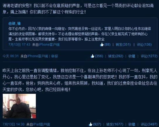 岳云鹏也发微博表达哀痛和坚持演出的决定:“这辈子接到最痛苦的电话,您走了,我却远在天边,iPad有父亲照片,磕头求父亲原谅,最后时刻没有陪在父亲身边!思索再三,决定演完再往家赶,戏比天大,希望父亲能够理解,爸爸:天堂没有疾病,一路走好,儿子永远爱您!”