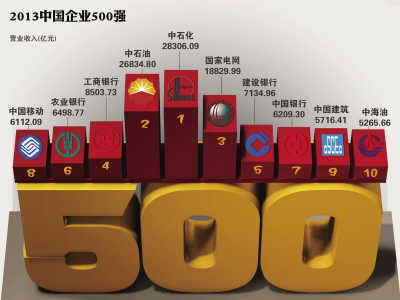 一年一度的中国企业500强榜单新鲜出炉。8月31日,中国企业联合会、中国企业家协会昨日在昆明发布了2013年500强榜单,中国石油化工集团(下称“中石化”)以2.83万亿元的收入连续九年位居500强榜首。