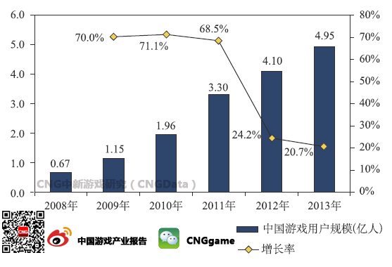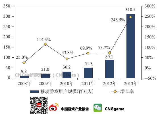 据游戏工委、CNG中新游戏研究联合发布的《2013年中国游戏产业报告》显示,2013年,中国游戏市场用户数量约达4.95亿人,其中移动游戏用户数量同比2012年增248.5%。未来移动游戏增长预期强劲。