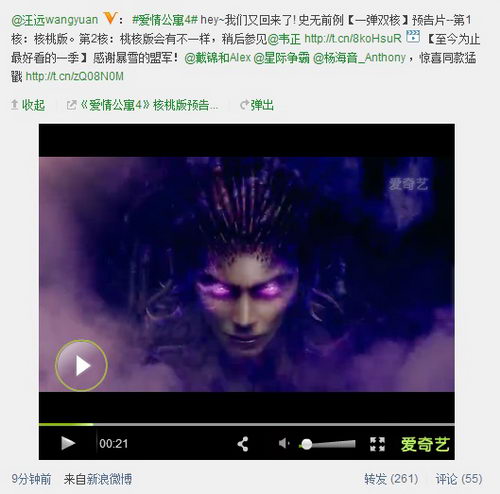 《爱情公寓4》制片人汪远在微博上把新预告片转发给暴雪中国总经理戴锦和后,戴总迅速接招:“听说《爱情公寓》里有不少星际高手,有空来我们这玩儿,顺便给你们看点的新东西。”